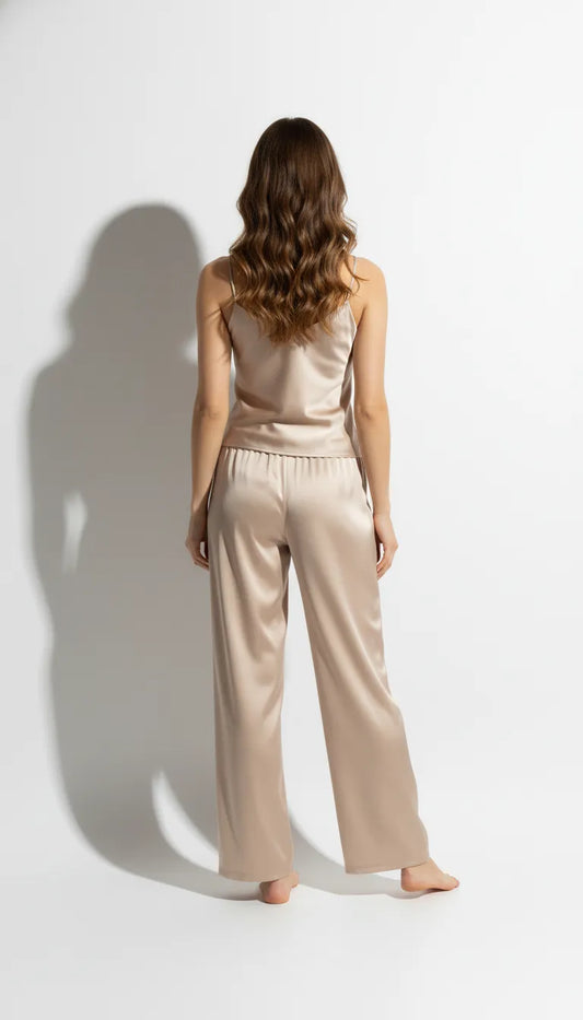 L'ensemble pyjama long en satin beige représente le classicisme revisité de la lingerie de nuit de luxe.