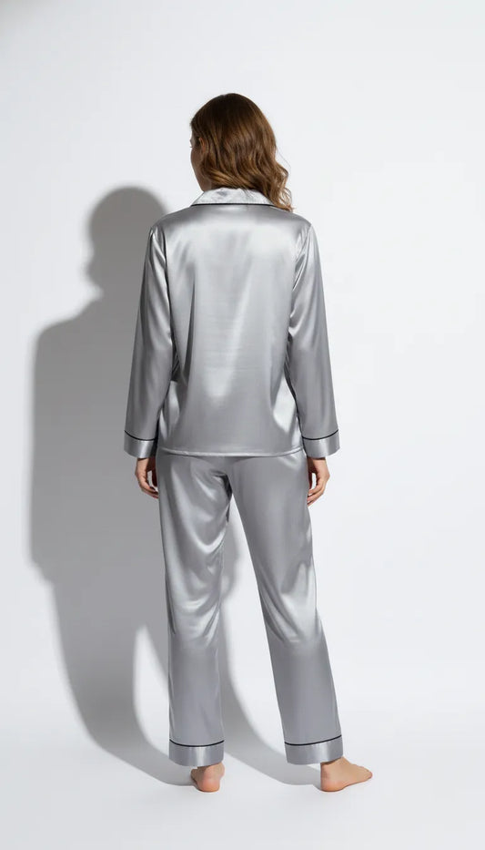 Pyjama long en satin gris (pantalon et chemise)